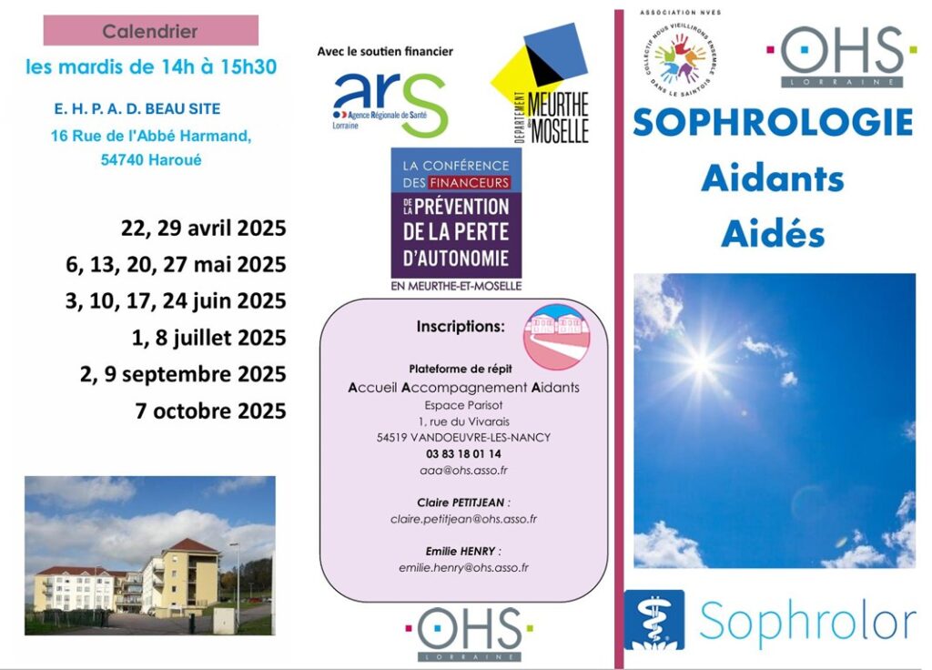 De avril à octobre 2025, un cycle de 15 séances de sophrologie a été proposé à l’EHPAD Beau Site d’Haroué (ACIS-France), à destination des aidants et aidés du Saintois, dans le cadre des actions de la Plateforme de répit de l’OHS de Lorraine.