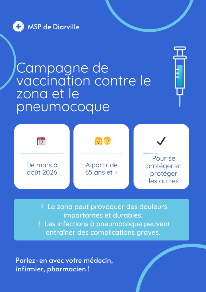 La Maison de Santé Pluriprofessionnelle de Diarville lance une campagne de sensibilisation à la vaccination contre le zona et le pneumocoque, deux infections qui peuvent entraîner des complications importantes, notamment chez les personnes âgées.