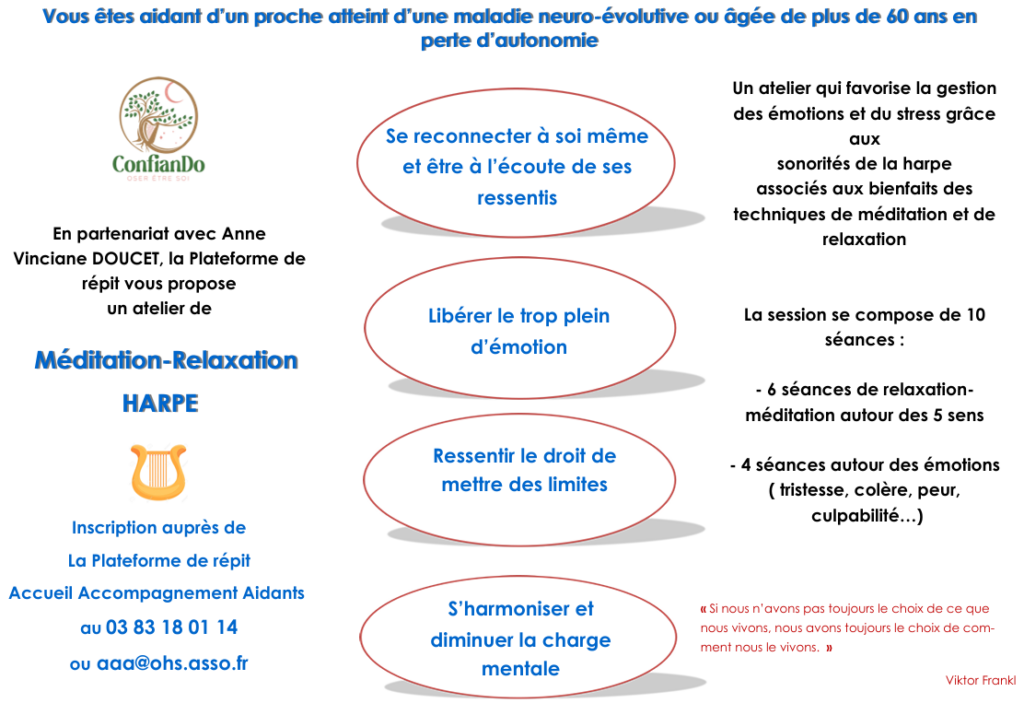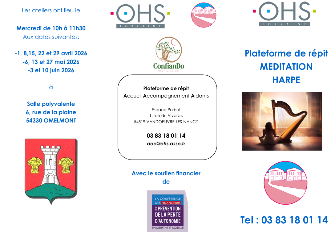 Pour offrir un temps de respiration aux aidants du territoire, la Plateforme de répit Accueil Accompagnement Aidants (OHS de Lorraine) propose un cycle de 10 séances de Méditation – Relaxation accompagnées à la harpe, à partir du 1er avril 2026 à Omelmont.